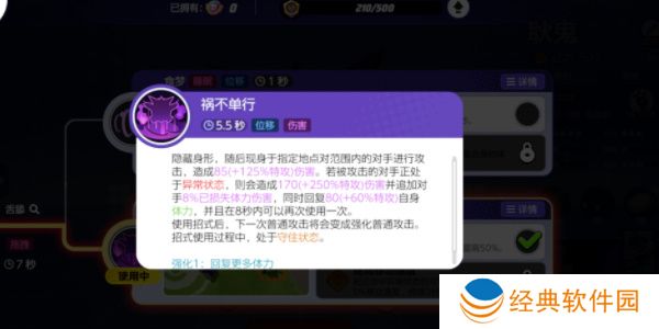 隐藏身形,随后现身于指定地点对范围内的对手进行攻击,造成85(+125%特攻)伤害。若被攻击的对手正处于异常状态,则会造成170(+250%特攻)伤害并追加对手8%已损失体力伤害,同时回复80(+60%6特攻)自身体力,并且在8秒内可以再次使用一次。