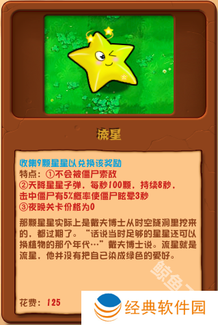 特点:不会被僵尸索敌。天降星星子弹,每秒100颗,持续8秒,击中僵尸有5%概率使僵尸眩晕3秒。夜晚关卡价格为0。