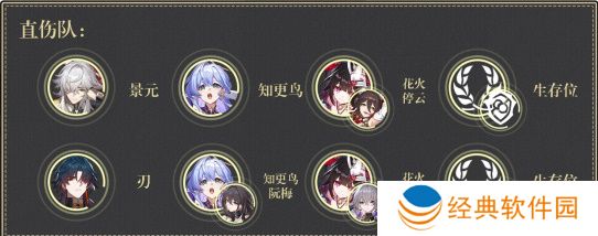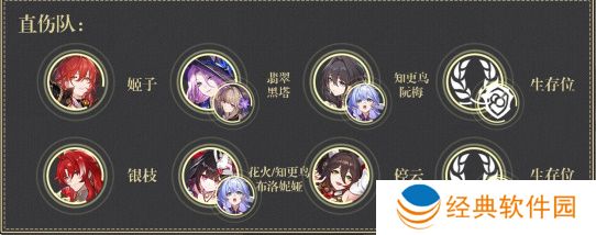 直伤队:姬子+黑塔/翡翠+阮梅/知更鸟+生存位,增益效果:噱头。