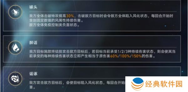 我方全体击破特攻提高30%,击破敌方目标时会令敌方全体陷入风化状态,每回合开始时受到固定数值的风属性持续伤害。