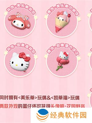 同时拥有<美乐蒂>玩偶&<凯蒂猫>玩偶两款外观的蛋仔还可获得【头像框-花园野餐】。