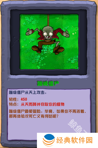 植物大战僵尸杂交版蹦极僵尸怎么样的属性内容在这里为广大玩家展出,是一个可以从天上攻击的僵尸,你要小心保护你的植物,那么下面就让本站站的小编来为您介绍一下。植物图鉴 僵尸图鉴 植物大战僵尸杂交版蹦极僵尸属性详情图鉴 蹦级僵尸从天上攻击。韧性:450特点:从天而降并窃取你的植物蹦级僵尸最爱冒险。毕竟,如果你不再活着,那再体验次死亡又有何妨呢?