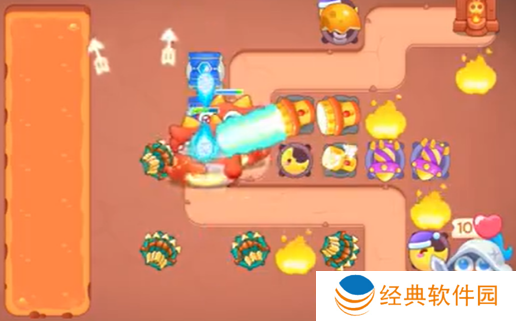 5、第五波兔子出现前,弓箭炮台被拯救出来,右侧只剩下两个火山,先在终点旁放置礼花炮升到满级。等金币数量足够,在出口放置电筒炮升满级。左侧火山中放置弓箭和礼花先升级,第五波结束前,大家能获得两个牛奶奖励。
