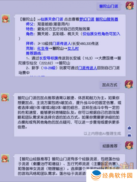 以上图为例,面对普陀山门派介绍及其加点、经脉推荐等连续提问,全新的梦幻精灵能够提供连贯的回答。