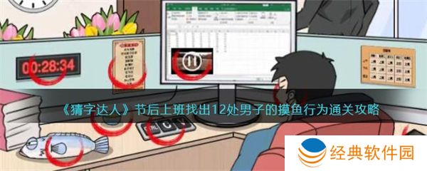 猜字达人节后上班找出12处男子的摸鱼行为通关攻略:1. 找出以下12处男子的摸鱼行为:逗猫达人、养生泡脚、摸鱼抱枕、高效工作法、诡计多端、下班倒计时、一心二用、随时干饭、按摩椅办公、外卖研究员、相声爱好者、接水狂魔。