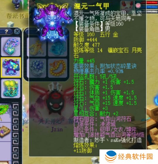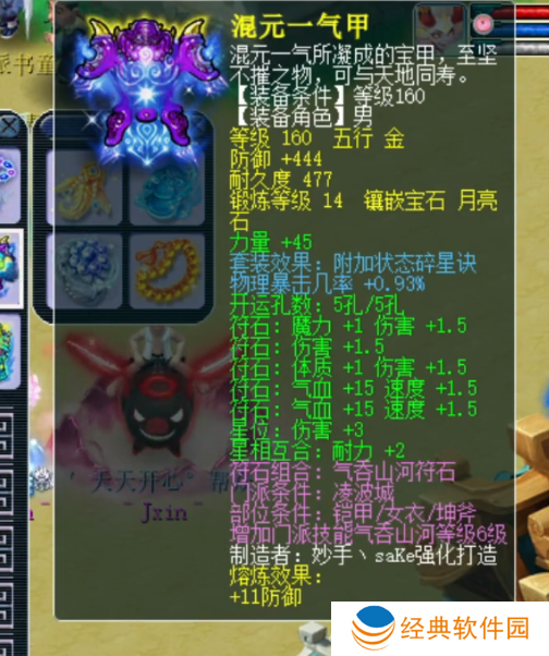 160级男衣,附加物暴几率+0.93%,14锻月亮石,熔炼后防御+455。