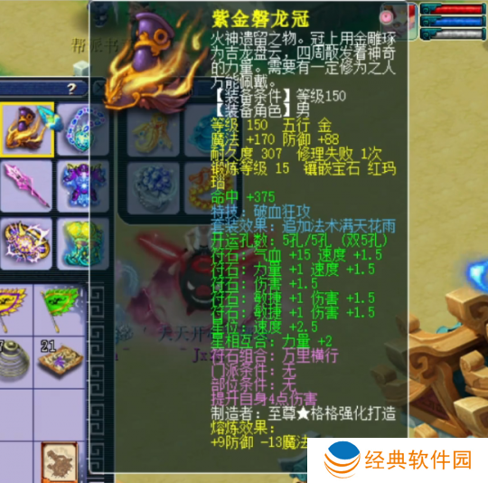 150级破血狂功男头,15锻红玛瑙,熔炼后防御+97。