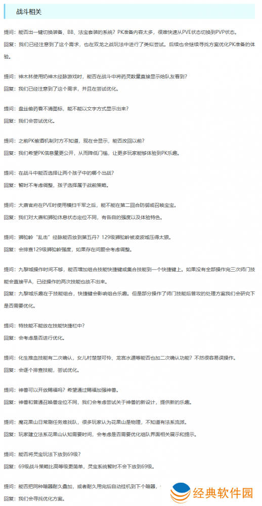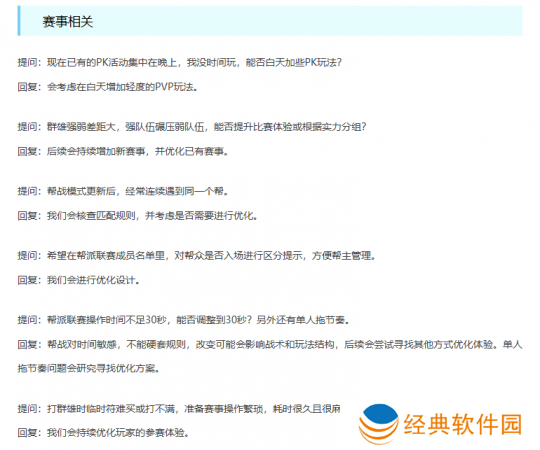 赛事相关的问题主要集中在日常PK上,策划也表示会考虑增加在白天的轻度PVP玩法,并会根据大家的实力优化已有赛事。除此之外,策划相当重视帮派联赛的体验,有望会对成员管理、单人拖节奏、赛前准备过多等的问题进行优化。