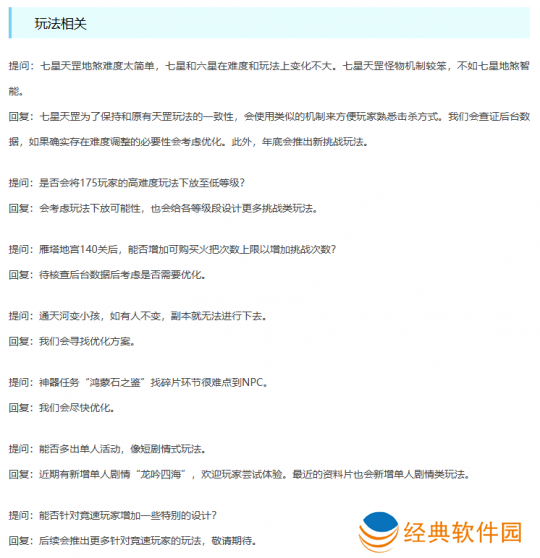 关于玩法方面的问题主要集中在七星天地、神器任务和雁塔迷宫方面,主要方向依然是以优化为主。不过,策划不仅透露会在年底放出新的挑战玩法,还表示会考虑下放部分高难度玩法,并会对竞速玩家进行一些特别的设计,大家可以期待一下。
