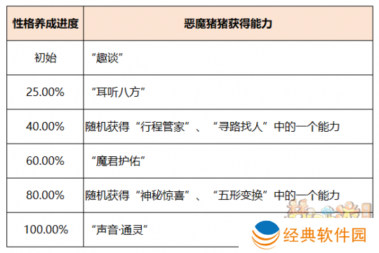 随着恶魔猪猪性格属性的提升,当培养进度达到25%、40%、60%、80%、100%时将分别解锁一个独特的能力。