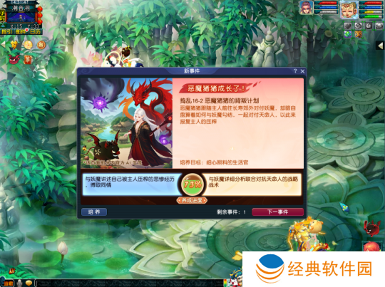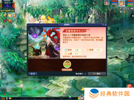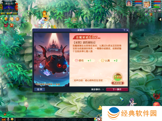 观看恶魔猪猪的奇遇故事并且帮它做出抉择,根据选择的不同获得对应的属性提升。这类事件提升的属性较多,需要玩家根据选项中的文案自行判断增加的属性,随着性格养成进度提高奇遇故事才会出现。