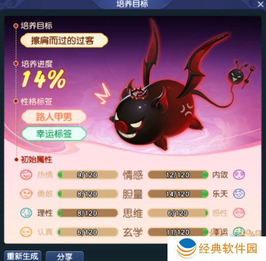选定培养目标后,将获得随机分配的初始属性和性格标签。点击【重新生成】可以刷新初始属性和第2条标签,但无法改变第1条标签。恶魔猪猪的初始属性总和在100点左右,每次刷新会产生波动。总属性达到500点,即达成100%养成进度。
