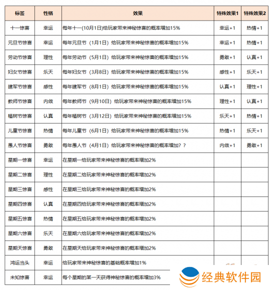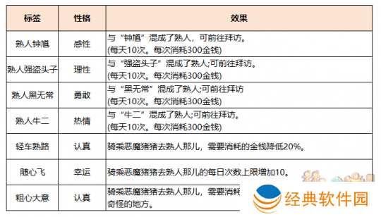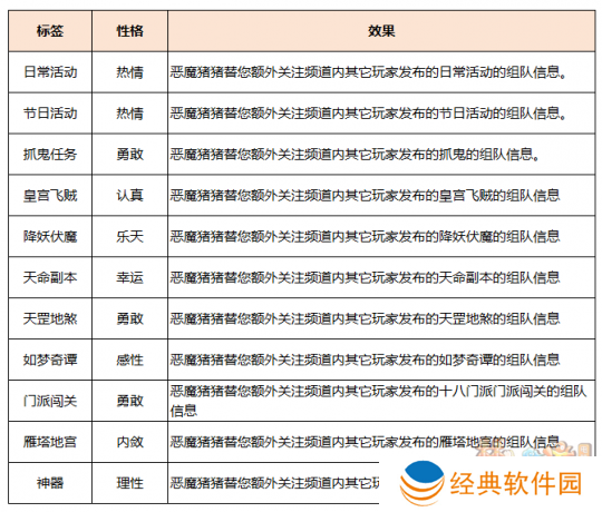 玩家骑乘恶魔猪猪体验你的生活和各种玩法(周末活动、普通副本、侠士副本、天命副本、捉鬼、如梦奇谭、帮派迷宫等),将触发形形**的恶魔猪猪调皮捣蛋的事件,完成后可以提升恶魔猪猪的“性格属性”。不同玩法可获得的性格属性不同,具体见下表。