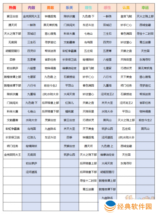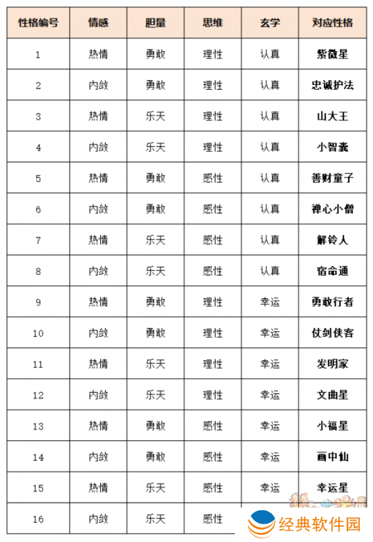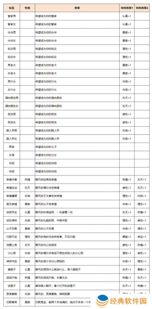 在这里向大家偷偷透露一部分热门标签的对应属性,【熟人钟馗】对应理性,【熟人黑无常】对应勇敢,【鸿运当头】对应幸运,【天覆阵】对应认真。性格标签可分为趣谈、神秘惊喜、寻路找人、魔君护佑、行程管家、五形变换、声音·萌宠、声音·通灵、特殊标签共9个类别,总结了部分类别的标签内容,更多内容有待玩家在游戏中自行发掘。