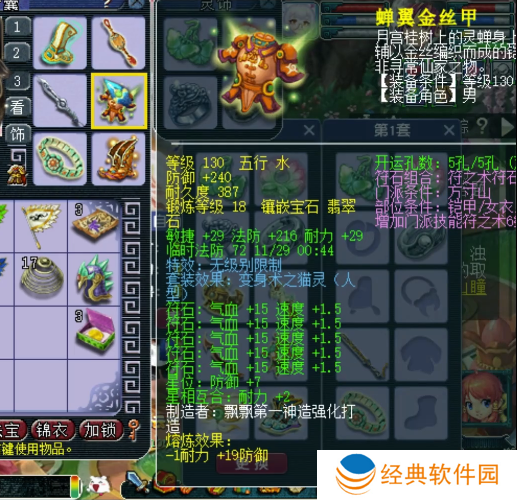 130级无级别男衣,18锻翡翠石,熔炼后防御+259,敏捷+29,耐力+28。