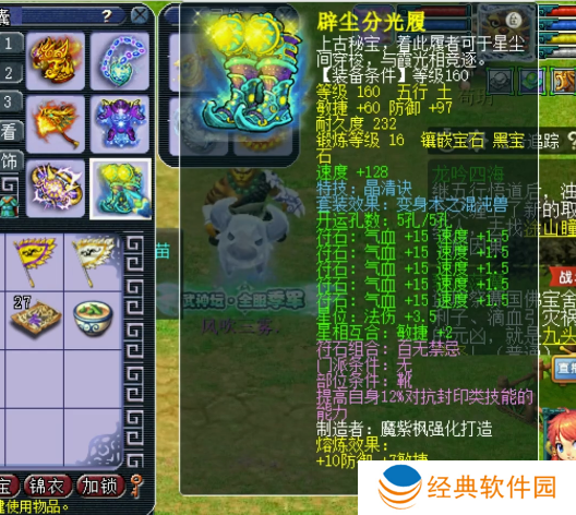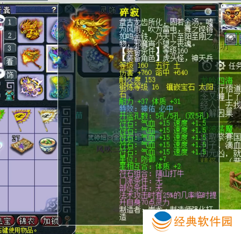 160级神佑必中武器,16锻太阳石,伤害+760,耐力+37,体质+31。