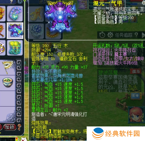 160级不磨男衣,附加法暴几率+1.18%,16锻舍利子,熔炼后防御+318,耐力+35,力量+37。