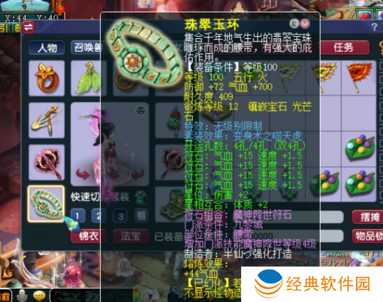 100级无级别腰带,12锻光芒石,熔炼后防御+72,气血+744。