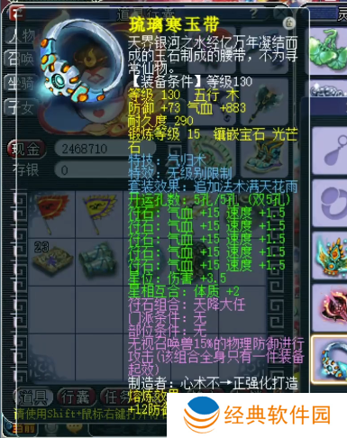 130级无级别气归术腰带,15锻光芒石,熔炼后防御+85,气血+914。