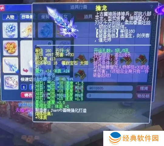 今天看到风哥的硬件,有一把号称全服第一法系武器。160级剑,命中+697,伤害+730,打了16段太阳石,魔力+34,体质+31,特效是神佑,还附加法术暴击几率+0.94%。这初伤高、双加好,还带着神佑和法暴击几率,真是顶级!