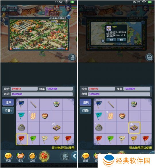 道具界面仅有道具、行囊以及梦幻币相关的内容信息。双击物品可以使用,但在进行飞行旗,飞行符操作时,同样存在需要在上方界面进行二次操作的问题。而且在道具界面没有解锁按钮,只能通过如仓库设置界面呼出,或切回横屏模式进行全面解锁操作。