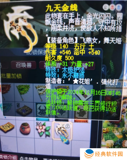 一名少侠闲着无聊鉴定了一件140级环圈,没想到逆袭了,炸出了双蓝字,伤害+546,命中+540,体质+31,力量+27,特技是太极护法,特效是永不磨损,这个伤害还是不错的,加上双蓝字基本上能卖七千块吧。美滋滋,毕竟是一件就鉴定出了,真是太舒服了!