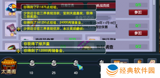 1.每天活跃积分达到25点之后,可以获得12000两储备金,有一定几率奖励翻倍。活跃积分达到40点后同样可以获得12000两储备金,而且还可以获得一个红罗羹或绿芦羹作为补给。