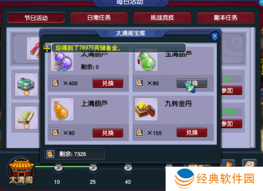2.每天可以通过太清阁兑换玉清葫芦,葫芦内含80000两左右储备金。