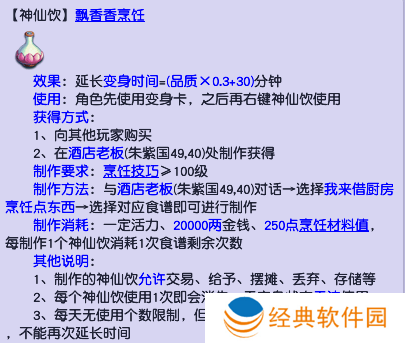 为了发挥变身卡最大价值,老玩家一般会去买一个“神仙饮”。该道具有延长变身时间的效果,延长的时间为品质*0.3+30分钟。也就是说,你变身后吃一个120品的神仙饮,就可以将你的变身时间延长66分钟,这个延长时间可以直接叠加在变身卡剩余时间上。