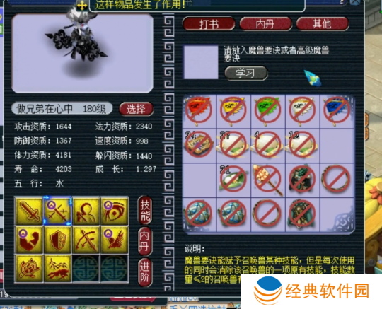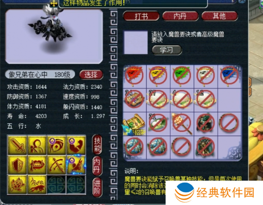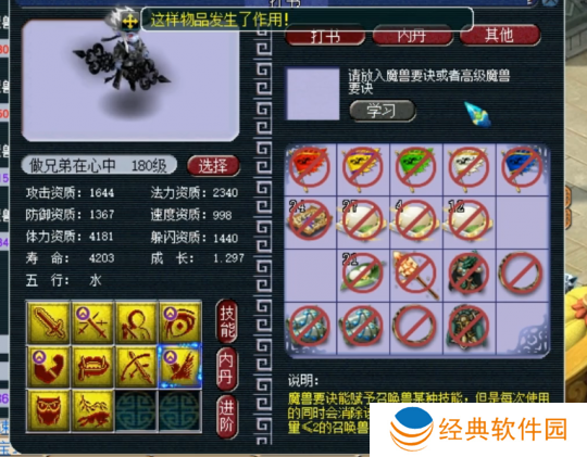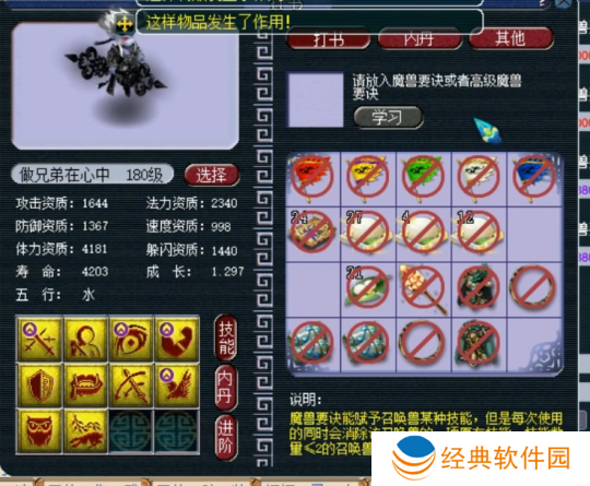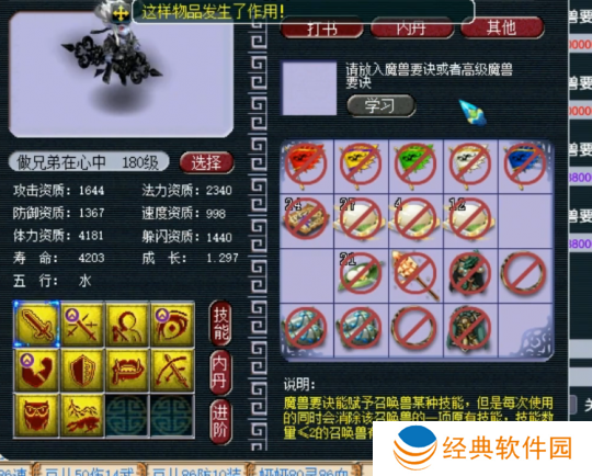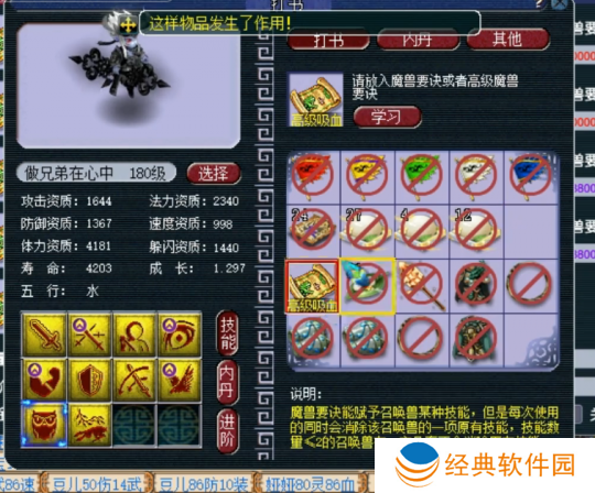 最后上高级飞行,掉高级防御,至此,玩家的召唤兽技能已齐全,且完全符合四赐福技能的要求,改书之旅**成功!令人惊叹的是,他仅用了五本高级兽诀便完成了这一壮举,运气之佳,实属罕见。