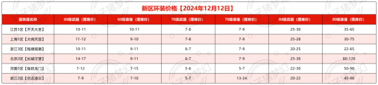 从60-80级环装价格来看,刚刚开服和活跃度较高的服务器物价水平偏高,部分大区虽然环装价格有明显变化,但这主要同点卡比例有关,点卡越高、环价也就越高。
