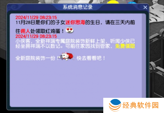 这位玩家今天上线以后发现不只是自己孩子的生日,而且系统还赠送了奖励。因为这位玩家拥有的祥瑞不以数记,可以前往家园找管家免费领取全新的庭院装饰一份,原来祥瑞多还有这种好处啊。