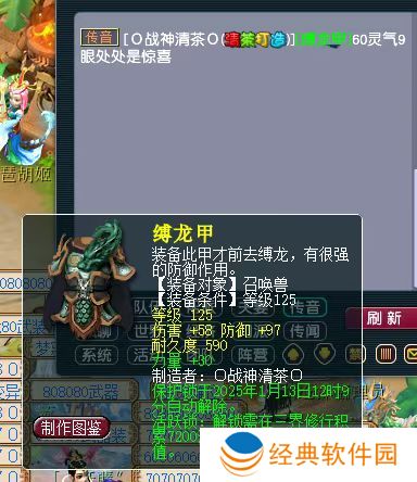 今日,有位小伙伴在用60灵力的九眼天珠打造召唤兽装备时,炸出了一件基础58伤,97防,附加30力量的召唤兽铠甲。虽然这件装备初防不高,但由于其可以给召唤兽提供大量伤害加成,综合价值并不低,换个遥遥领先问题不大。