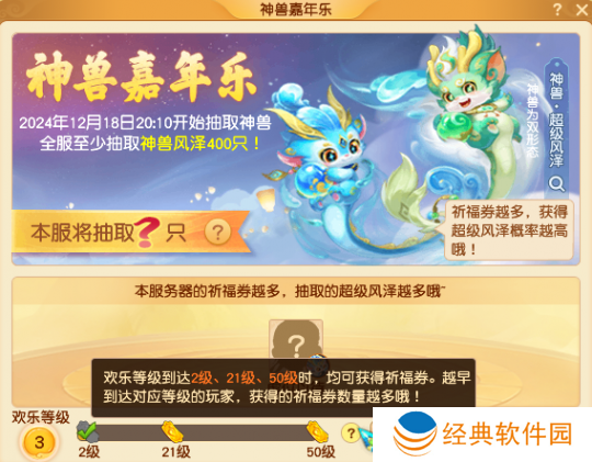 将嘉年华狂欢盛典等级提升至2级、21级、50级时还可以获得祈福券,祈福券可以用来抽取本服的超级风泽,祈福券越多、中奖几率也就越高。