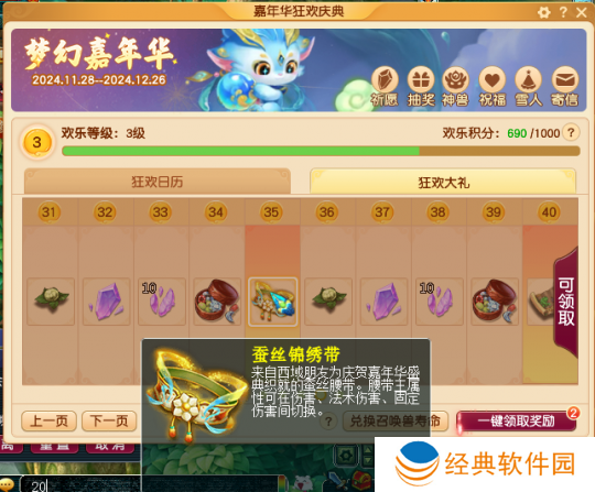 如果想获得满级腰带,就需要将嘉年华狂欢盛典等级提升到35级,共需要35000点积分。由于本次嘉年华活动周期为2024年11月28日至12月26日,所以大家只要在一个月内刷满积分即可。