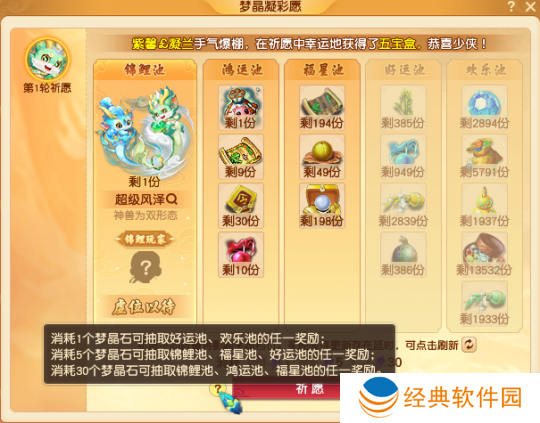 由于嘉年华狂欢盛典等级提升主要靠环任务、小副本,所以大家可以获得不少梦晶碎片、梦晶石,只要集齐5个就可以获得抽神兽的机会,集齐30个的话还可以抽取高级魔兽要诀、神兜兜、特赦令牌、高级召唤兽内丹等奖励!