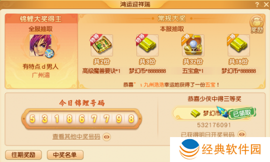 每日参加小副本后,还可以获得一个锦鲤号码,锦鲤号码不仅可以获得抽神兽的资格,还能在本服抽取特等奖、一等奖、二等奖和三等奖,其中特等奖会抽出2本高级魔兽要诀和3份888W的梦幻币奖励。