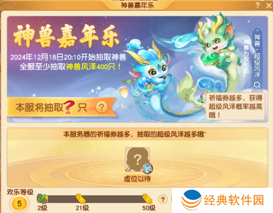 在本次嘉年华活动中有本服抽奖机制,欢乐等级越高,能拿到的祈福券数量也就越多,中奖几率也就越高。当欢乐等级到达2级、21级、50级后,必定获得祈福券。需要注意的是,当欢乐等级到达21级或50级时,将根据在本服务器中到达该等级的先后顺序,发放不同数量的祈福券。