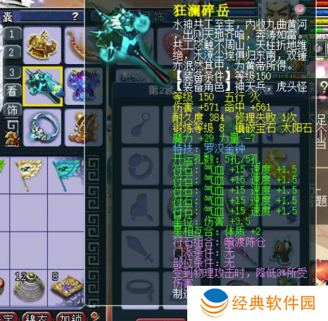 150级罗汉金钟武器,8锻太阳石,伤害+571,魔力+29,力量-7。