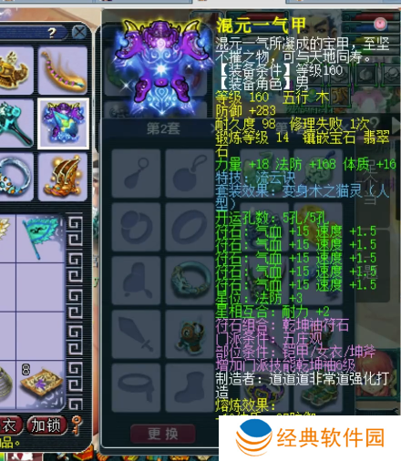 160级流云诀男衣,14锻翡翠石,熔炼后防御+320,力量+18,体质-6。