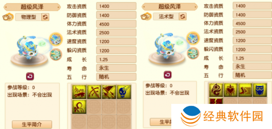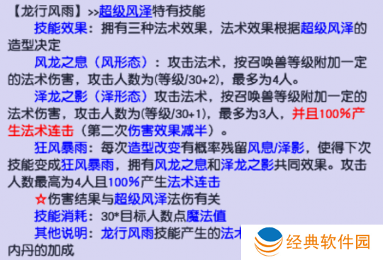 超级风泽和其他神兽一样,拥有物理和法术两种形态。其中,物理形态的技能为:高级神佑复生、高级连击、高级合纵、驱鬼和高级偷袭,法术形态的技能为:专属技能龙行风雨、高级魔之心、高级敏捷、高级感知、高级法术暴击。