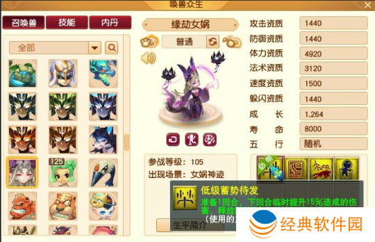 第三只:缘劫女娲,参战等级105级。缘劫女娲洗出来最多有4个技能,其中必带技能为低级蓄势待发,该技能也是新出的特殊技能之一,技能效果是准备1回合,下回合临时提升15%造成的伤害,释放随机2个主动技能攻击,纯粹是点杀必备技能。