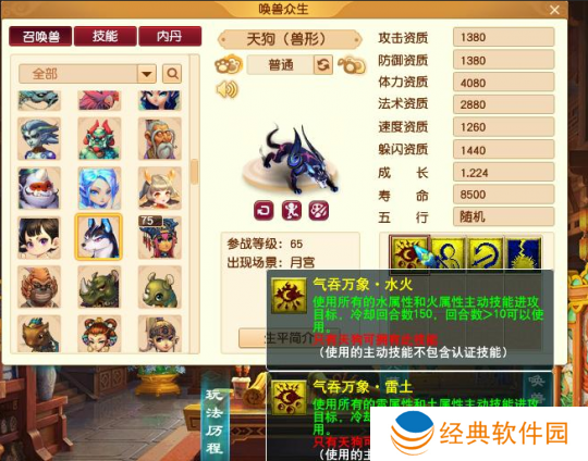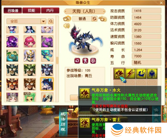 第一只:天狗(兽形),参战等级65级。兽形天狗最多可以洗出4个技能,且没有必带的技能,洗出来的资质攻击、防御上限1380,速度资质1260,成长1.224。兽形天狗携带的特殊技能是“气吞万象,水火/雷土”,使用水火技能,可以施放所以水属性和火属性主动技能,包含大水、大火、小水、小火,使用雷土与水火情况类似。相信看到这里,大家心中都跳出了观照万象技能,可以施放所有主动技能,这里的气吞万象纯粹的是观照万象简化版,有玩家调侃,直接起名字叫“千照万象”更容易理解。