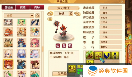 第四只:大力鬼王,参战等级飞升125级。大力鬼王最多可以洗出5个技能,其中大火是必带,除此之外还有高级蓄势待发技能,准备1回合,下回合临时提升30%造成的伤害,释放随机2个主动技能攻击。高级技能果然是低级技能的加强版,点杀能力更强。