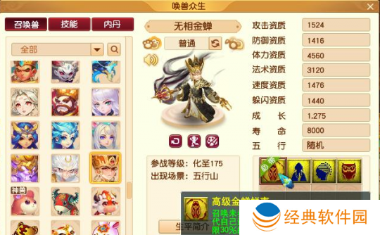 第五只:无相金蝉,参战等级化圣175级。无相金蝉最多可以洗出4个技能,成长高达1.275,其中必带技能高级金蝉脱壳,效果可以召唤未参与过本场战斗的另一只召唤兽替代自己进入战斗,但使其受到自身气血上限的30%的伤害。这个技能才是真正的PK神技,说白了就是召唤兽召召唤兽,这种召唤兽的出现,对于三攻队冲刺加成太高了,纯粹的是一波流PK打发。高级金蝉脱壳拉一只须弥瞬法冲刺一波,人物接着拉须弥瞬法冲刺,说白了就是一个角色一回合可以2两只须弥瞬法,想想就挺暴力的,一回合冲10次须弥瞬法,很少有队伍能抗住吧?