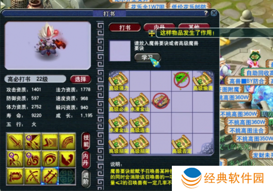 总共花费了58本高级兽决,其中不乏价格昂贵的兽决,且多次出现技能循环的情况。尽管这种不带特殊技能的胚子打书相对简单,但运气不佳时遇到技能循环也会让玩家付出不小的代价。