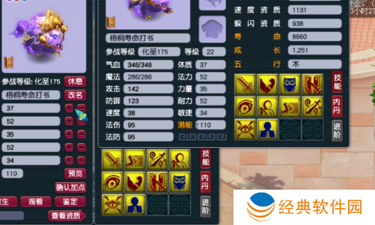 近期,梧桐使用了寿命**,帮方总的10JN谛听打书。由于资质出色,所以往物理路线发展,经过一通操作之后,它已经变成八红技能,后续坐等千亿兽诀死亡和力劈。