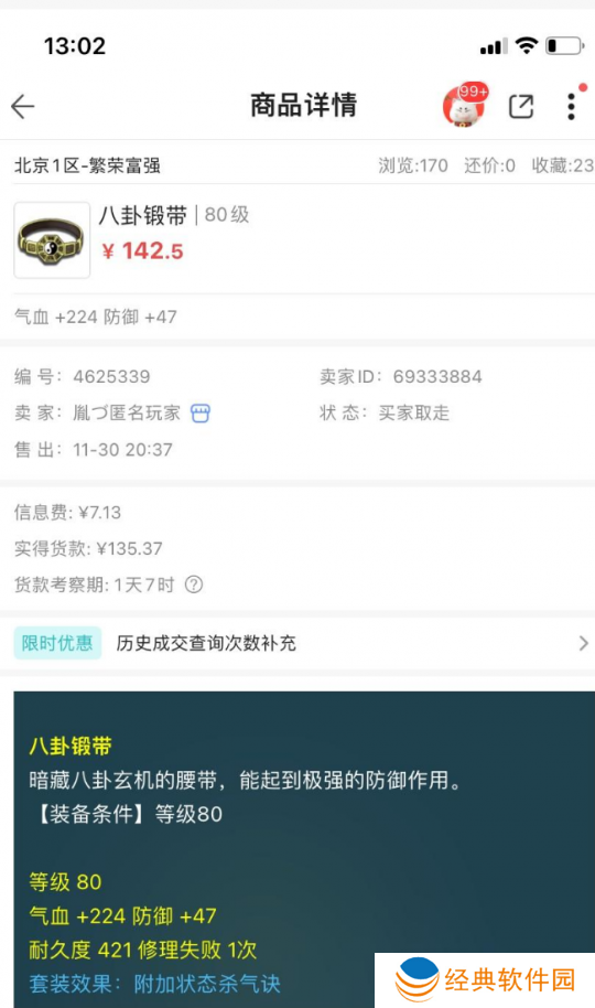 最近一个兄弟的80级的腰带,气血+224,防御+47,套装带的是杀气诀,以142.5元的价格卖掉了,这个腰带最开始你们猜猜这个兄弟多少钱收的呢?肯定是猜不到的,仅仅只花了10元,反手就翻了14倍,美滋滋呀,真是太香了!