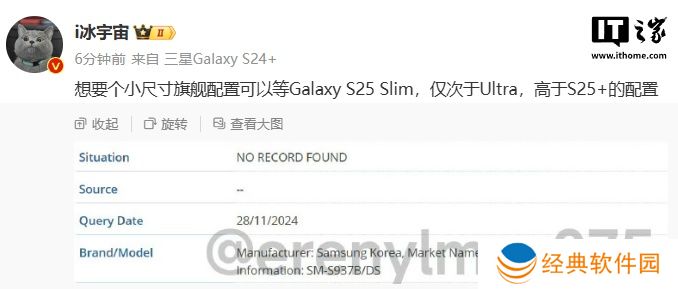 与Galaxy Z Fold 特别版不同,Galaxy S25 Slim 将在国际上发售。X 平台博主 erenylmaz075 今日发现型号为 SM-S937B 的三星设备证实了这一点,“B”表示这是手机的全球版本。另一位博主@i冰宇宙 则透露,这款新机采用旗舰配置,并且是仅次于 Ultra,高于 S25 + 的配置。