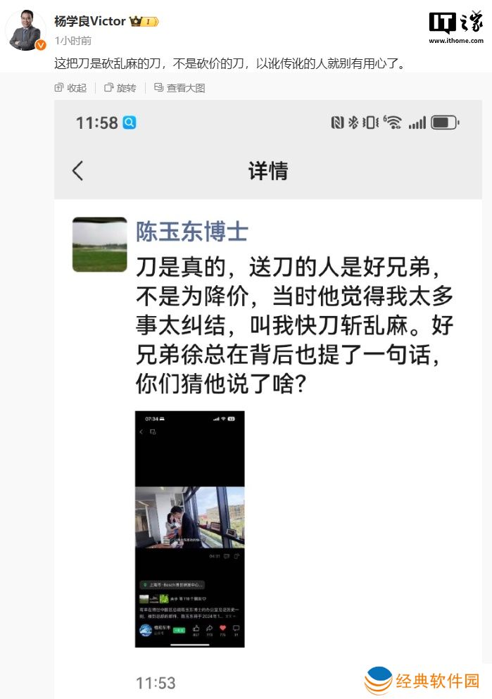 对此,陈玉东今日在朋友圈发文回应表示:“刀是真的,送刀的人是好兄弟不是为降价,当时他觉得我太多事太纠结,叫我快刀斩乱麻。”